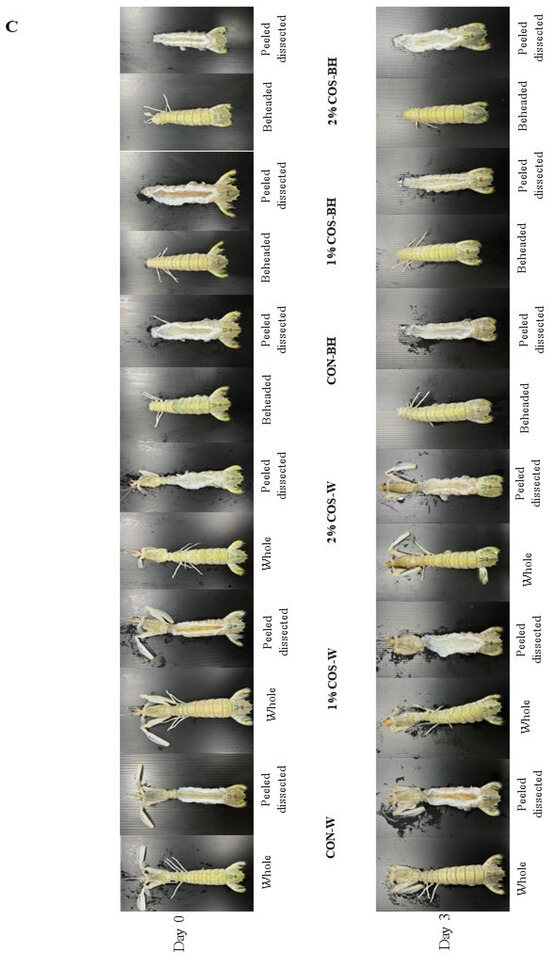 Coincidently, the anatomical observation supported the above histological images as illustrated in Figure 5C. The fresh sample on day 0 had firm muscles, and the digestive tract was found intact in the CON-W, 1% COS-W and 2% COS-W samples. Nonetheless, the CON-BH, 1% COS-BH, and 2% COS-BH samples had firmer muscles and well-organized empty digestive cavities, compared to the whole samples. The whole samples rich in trypsin underwent degradation to a high extent, in which the muscle was destructed and softened. The PEF pretreatment electroporated the hard shell of the HMS, and a larger amount of COS was able to penetrate into the muscle, especially when a higher concentration of COS was used. On day 3, the whole sample had a mushy muscle texture. The CON-W sample was more mushy or pasty, compared to the other samples, including the beheaded ones. Among all the samples, the 2% COS-BH sample had the least mushiness. Thus, it provided a prominent significance of the COS treatment and beheading for preventing the muscle softening of the HMS. The anatomical data coincided with the shear force and histological images.