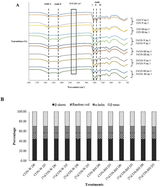 Effects of prior pulsed electric field and chitooligosaccharide at different concentrations on FTIR spectra (A) and secondary structure representing the β−sheets, random coil, α−helix and β−turns (B) of meat from Harpiosquillid mantis shrimp (Harpiosquilla raphidea) at day 0 and 3 of storage in iced water. D0 and D3 represent Day 0 and Day 3, respectively.