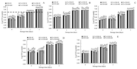 Effects of prior pulsed electric field and chitooligosaccharide at different concentrations on total count (A), psychrophilic bacteria count (B), Pseudomonas spp. count (C), Enterobacteriaceae count (D) and Shewanella spp. count (E) of meat from Harpiosquillid mantis shrimp (Harpiosquilla raphidea) during storage in iced water. Bars represent the standard deviation (n = 3). Different lowercase letters within the same storage times denote significant differences (p < 0.05). Different uppercase letters within the same sample denote significant differences (p < 0.05). The dashed line represents the safety limit of 6 log10 CFU/g.