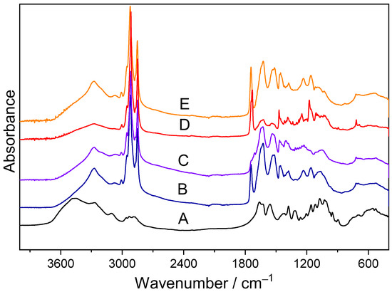 Another typical IR band between all the ingredients was observed around 1740 cm−1. This IR band can be associated with stretching C=O bonds from ester groups related to lipids.