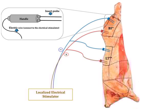 Twenty Hanwoo steers (average age of 31 months) were used in this experiment, comprising three heads of grade 2 quality, seven heads of grade 1 quality, seven heads of grade 1+ quality, and three heads of grade 1++ quality. All animals were shipped from feedlots to a commercial slaughterhouse and held in lairage following normal plant operating guidelines and Korea Animal Plant Quarantine Agency of Ministry of Agriculture, Food and Rural Affairs regulations for beef slaughter. These animals were slaughtered following the regulation for beef slaughter, and then immediately moved to a chilling room and stored at 4 °C. In the chilling room, the Longissimus thoracis (LT) and Biceps femoris (BF) muscles from the right side of the carcasses were electrically stimulated using an electrical stimulation device with a specialized probe. Figure 1 shows the design of the localized electrical stimulation probe and the locations where it was inserted into the carcasses. The left side of the carcasses of the same animals were used as the control. Electrical stimulation was performed with alternative current (AC), 45 V for 1 min. All electrical stimulation was completed within 30 min of slaughter. After 24 h in the chilling room, all carcasses were graded according to the Korean Beef Carcass Grading System []. The LT and BF muscles were taken from both the left and right sides of the carcasses at 36 h postmortem, and then transported to the Jeonbuk National University Meat Science Laboratory in a chilled condition. These muscles were divided and vacuum-packed using a household vacuum-packaging machine (VS2011, Food saver®, Atlanta, GA, USA), and then stored for 2 and 14 days at 4 °C until analyzed. The packaging material used for vacuum packaging was a 4-layer (LLDPE/LDPE/LDPE/Nylon) film-material vacuum bag.
