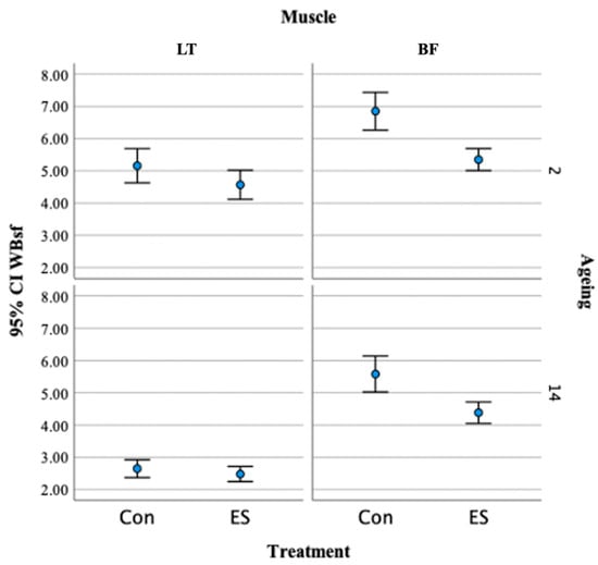 Table 4 shows the effect of localized electrical stimulation of the carcass on improving the tenderness of the LT and BF muscles on aging days 2 and 14. Based on the shear force value of the LT muscle at day 2 in the control, the effect of reducing the shear force value of these by aging was greater than that of localized electrical stimulation. For the BF muscle, the initial shear force decreased by 1.5 kg, which was greater than the decrease in shear force (−1.27 kg) observed in the control group after 14 days, indicating that the starting point of tenderization by aging for the BF muscle could be lower than the WBsf of the control group at 14 days, or even more.