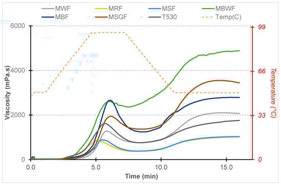 RVA viscograms of analyzed flour samples. MWF—wholemeal wheat flour; MRF—wholemeal rye flour; MSF—wholemeal spelt flour; MBF—wholemeal barley flour; MBWF—wholemeal buckwheat flour; MSGF—wholemeal sorghum flour; T530—plain wheat flour type 530.