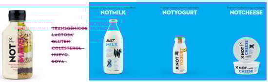 Examples of eco-innovative products from NotCo: NotMayo, NotMilk, NotYogurt, NotCheese. Source: Retrieved by CNN Chile (https://bit.ly/44a6y3O, accessed on 11 November 2022). Note: The image shows the company’s products from NotCo, and the words crossed out are ingredients excluded. Transgénicos meaning transgenic; Lactosa meaning lactose; Gluten meaning gluten; Colesterol meaning cholesterol; Huevo meaning egg; Soya meaning soy.