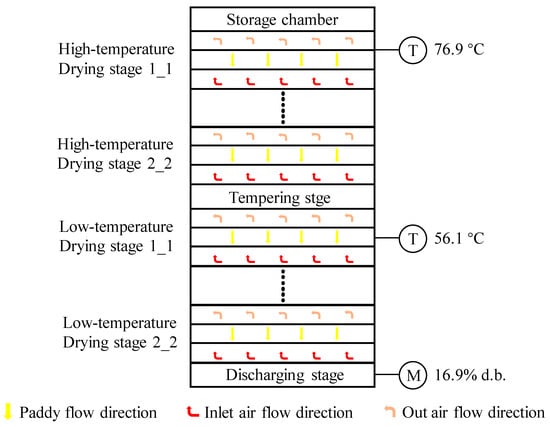 In this study, the industrial-scale multistate counter-flow paddy dryer (Model: 5HNH-15), designed by our laboratory and applied in Haina Grain Processing Center in Changsha, Hubei Province, China, was adopted as an experimental setup. The diagram of the dryer is shown in Figure 2. The total height and volume of the dryer are 14.32 m and 145.8 m3, respectively, and the capacity is about 90 t. The detailed drying process is as follows: Before drying, the freshly harvested wet paddy was fed into multistate counter-flow dryer by the hoist. Then, the induced fan, conveyor belt, elevator, and discharging motor were started in turn after the drying chamber was first filled with wet paddy. Paddy flowed from top to bottom of the dryer under gravity and sequentially passed through two high-temperature drying stages (with a thickness of 2 m) and two low-temperature drying stages (with a thickness of 2 m), accompanied by four tempering stages (with a thickness of 1.58 m). Finally, paddy that reached the safe moisture content was discharged from the dryer at the discharging stage.