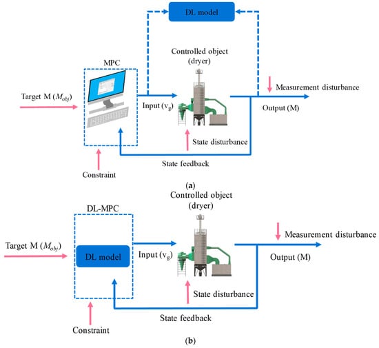 The above description for MPC illustrates that the essence of MPC is to obtain the future input based on a prediction model and measured system state data, wherein the actuator is the selected optimizer. To address the computational burden of classical MPC systems and enable their practical application in the field, the mapping relation between measurable state variables and control inputs can be established. This approach replaces the online optimization process in the classical MPC system, making it a more intuitive means of implementing MPC in field applications. Based on establishing a complete and accurate mechanistic simulation model for the drying system [,], a deep learning method can establish a mapping relation from state to action using a large amount of simulation data. This allows MPC to be implemented without the need for online optimization. The principle and primary implementation method are shown in Figure 3. The output in typical MPC (M in Figure 3a) is selected as the input of the deep-learning model, and the input in typical MPC (vg in Figure 3a) is selected as the output. Finally, a deep-learning-based optimizer, as shown in Figure 3b, can be obtained to replace the MPC in Figure 3a.