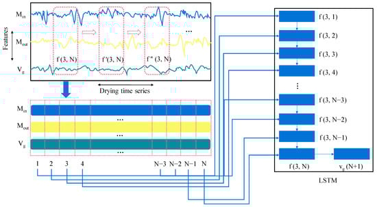 The application process of the LSTM-based predictive controller is illustrated in Figure 4. It involves taking a time-sliding window of system state variables and input variables, f(3, N), which are collected in a preserved time sequence order and fed into an LSTM network as inputs to predict the next moment’s system input, vg(N + 1), where N represents the length of the time series. As the drying progresses, the sliding window moves forward continuously, capturing f′(3, N), f″(3, N), and so on. The LSTM utilizes the input data to calculate the output for the next moment and transfers it to the drying system, completing the predictive control process. In this study, the selected system state variables are the inlet moisture content (Min) and outlet moisture content (Mout), while the input variable is the paddy flow velocity (vg). In this framework, adjusting the paddy flow velocity takes into account not only the current system state but also the historical states and inputs within a specified time period. This approach goes beyond a simple one-to-one correspondence between input and output at a single moment. By considering a broader range of information, it allows for a more comprehensive, extensive, and accurate understanding of the system dynamics.