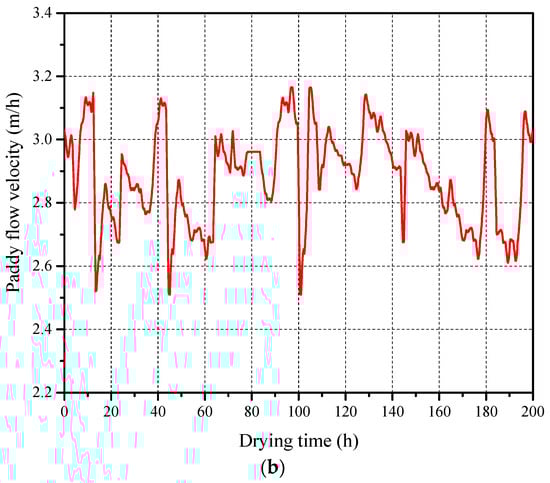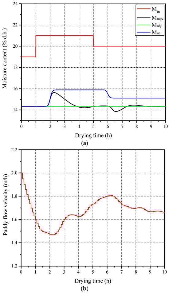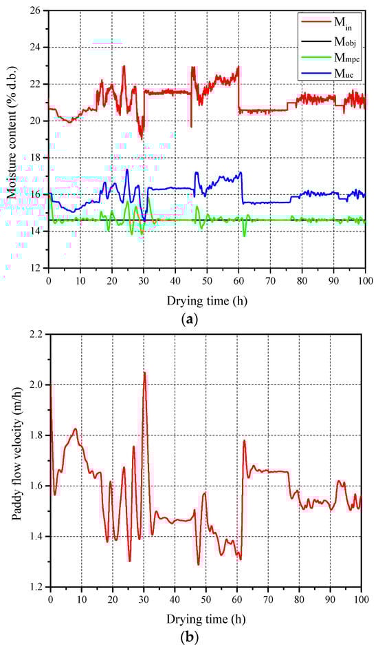 Test result of DL-MPC of single drying stage: (a) Paddy moisture content and (b) flow velocity.