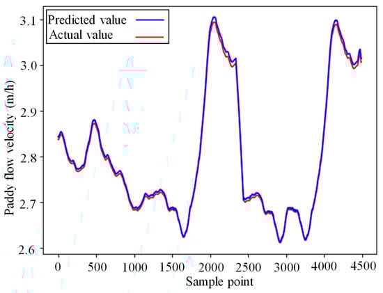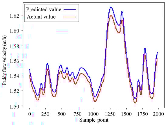 Upon reaching 11 epochs, the neural network prediction model exhibited a stable mean square error (MSE) and determination coefficient (R2) values. After completing 30 epochs, training concluded with an MSE below 0.0005 and an R2 exceeding 0.98. Utilizing this trained model, predictions were made on the test set and compared to actual values of paddy flow velocity in Figure 6. The curves of predicted and actual values closely aligned, indicating a strong resemblance. The mean absolute error (MAE) was 0.006 m/h, while R2 was 0.937, showcasing the LSTM neural network’s high accuracy in forecasting and its generalizability.