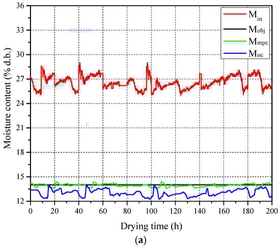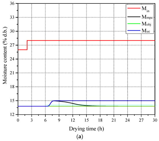 The obtained LSTM neural network model was imported into the MATLAB 2017b environment to replace the optimization process of the classical MPC and to construct a DL-MPC simulation system. This system was used to observe the response capability of the DL-MPC system to variations in paddy initial moisture content. The basic parameters for the ambient state, drying system, paddy, and initial state of drying air were taken from Table 2. The simulation results are presented in Figure 7. It can be observed that the DL-MPC system made corresponding adjustments whenever there was a sudden change in the inlet paddy moisture content. The simulation time for the DL-MPC system, running on the simulation software and hardware platform (Intel(R) Core CPU i5-11320 running at 3.2 GHz) under the drying conditions corresponding to a drying time of 10 h, was 7.245 s. In contrast, the simulation time for the classical MPC system under the same drying conditions was 144.889 s. This demonstrates that compared with the classical MPC, the DL-MPC system significantly improves computational speed while ensuring the completion of control tasks, making it more suitable for online processes.