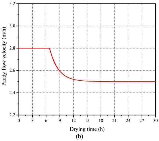 Some property values and equations used in the solving process are listed in Table 2. We have conducted multiple model validation experiments in our previous research [], and the results showed that the root-mean-square error (RMSE) for predicting paddy drying moisture content and temperature is 0.98% d.b. and 0.49 °C, respectively. The mean relative deviation (MRD) is 5.5% for paddy moisture content and 1.42% for temperature. These reasonable reliability indicators demonstrate the effectiveness of the mathematical model in analyzing actual paddy processes.