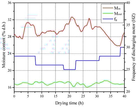 Real-time moisture content of inlet and outlet grain and frequency of grain discharging motor during drying process.