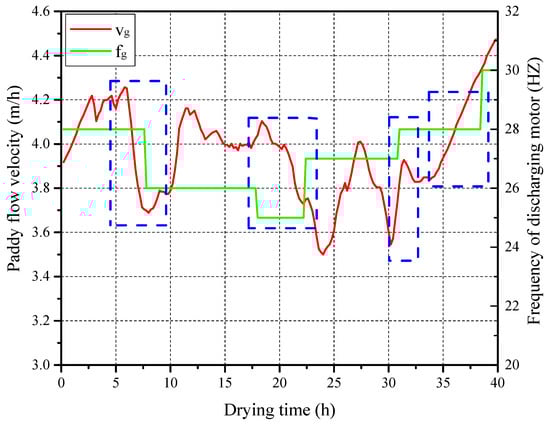 During the construction of the training dataset for the DL-MPC system, to reduce data quantity and facilitate the feasibility testing of the proposed method, it was assumed that the ambient state and ventilation parameters remained constant (taken as the average measured values). Based on field experimental data, the inlet paddy moisture content dataset was generated. The DL-MPC system was then constructed using the controller design method described in Section 3, followed by simulation. The predicted paddy flow velocity was compared with the actual frequency of the discharging motor. The results are shown in Figure 12. It can be observed that compared with the actual frequency of the discharging motor obtained from the field, the predicted paddy flow velocity exhibits a smooth variation and shows the same changing trend as the actual frequency of the discharging motor at multiple transition points (highlighted in blue boxes in Figure 12), indicating the effectiveness of the designed DL-MPC system. However, since the DL-MPC system ignores the variations in the ambient state and fluctuations in the inlet drying air conditions, the paddy flow velocity under DL-MPC strictly follows the changes in inlet paddy moisture content, resulting in some differences between the predicted data trends and the field data.