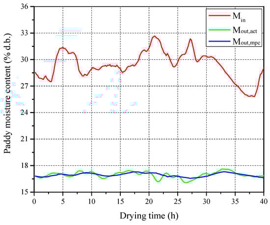 The predicted outlet paddy moisture content (Mout,mpc) obtained from the DL-MPC system is compared with the actual values (Mout,act), and the results are shown in Figure 13. It can be observed that compared with the actual outlet paddy moisture content, the predicted values are distributed more consistently around the target moisture content, with smaller variations as the inlet paddy moisture content changes. This is because the DL-MPC system has a higher adjustment frequency and more precise control than manual adjustments. The MAE between the predicted and actual values of the outlet paddy moisture content is 0.19% d.b.
