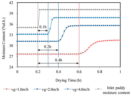 On the other hand, the unique material properties of paddy make its deep-bed drying process different from that of vegetables, fruits, and other agricultural products. It should be noted that the significant time delay characteristic of drying systems poses an important challenge in designing a paddy drying controller [,]. Although the controller designed for the multistage counter-flow dryer can achieve accurate process regulation, the adjustment time is excessively long, possibly exceeding 6 h. Figure 14 illustrates the transient response characteristics of paddy drying with step changes in grain moisture content at different paddy flow velocities, focusing on a single drying stage mentioned in Section 4.1. The figure shows that when the drying time is 0.2 h, the paddy moisture content jumps from 35% d.b. to 40% d.b., and the system transitions from one steady-state point to another, with a delay before the output begins to respond. For a paddy flow velocity of 1 m/h, the delay time is 0.4 h, the time for paddy to flow within the layer is 0.5 h, and the transition time is 0.6 h. Increasing the paddy flow velocity to 2 m/h reduces the delay time to 0.2 h, the flow time within the layer to 0.25 h, and the transition time to 0.3 h. Similarly, a paddy flow velocity of 4 m/h further decreases the delay time to 0.1 h, the flow time within the layer to 0.125 h, and the transition time to 0.15 h. In the step change process of grain moisture input, the transition time is greater than the flow time, which in turn is greater than the delay time. Additionally, higher paddy flow velocities require shorter delay and transition times. This analysis reveals that the flow-layer drying system exhibits pure lag characteristics, where information propagation is influenced by the time it takes for paddy to pass through the drying layer. Slower paddy flow velocities result in slower information propagation and longer system output delays. Relying solely on output feedback control for a system with pure lag characteristics leads to a significant overshoot, longer adjustment time, and poor control performance []. These findings align with previous studies that concluded that output feedback PID controllers [,] are not suitable for deep-bed flow-layer drying systems.