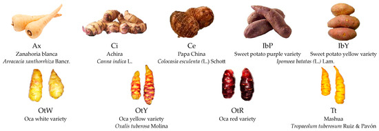 South America is one of the most megadiverse regions worldwide due to its biological variety, cultural richness, and economic potential. Contrary to popular belief, it has low food production and high malnutrition rates [1]. Developing nutritious foods from local crops poses a research challenge. The local crops comprise Andean roots, such as zanahoria blanca (Arracacia xanthorrhiza Bancr.), achira (Canna indica L.), papa China (Colocasia esculenta (L.) Schott), camote (Ipomoea batatas (L.) Lam.), oca (Oxalis tuberosa Molina), and mashua (Tropaeolum tuberosum Ruiz & Pavón) (Figure 1).