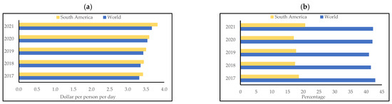 Comparison of (a) cost of a healthy diet (USD 1 per person per day) and (b) the percent of the population unable to afford a healthy diet worldwide and in South America. Source: FAOSTAT statistics database [11].
