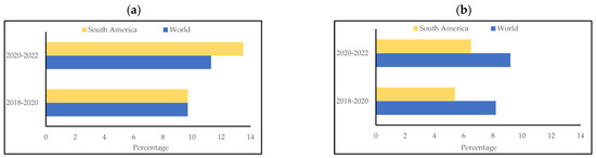 In addition, an alarming increase in food insecurity is evident in the South American regions (approximately 3% more compared to 2020–2022) (Figure 3a). This is due to decreased government initiatives during the postpandemic economic crisis [12]. Furthermore, the prevalence of undernutrition is more concerning and reached 13.9% in the last period (2020–2021) (Figure 3b). This value is another important indicator, as it shows the lack of knowledge of the nutritional properties of the region’s native crops. Sadly, many South American farmers sell the roots, vegetables, and fruits they grow to buy processed foods, which are usually less nutritious (such as potatoes, rice, pasta, and bread). This shows the need to value the crops developed locally the through research and development of processed products.