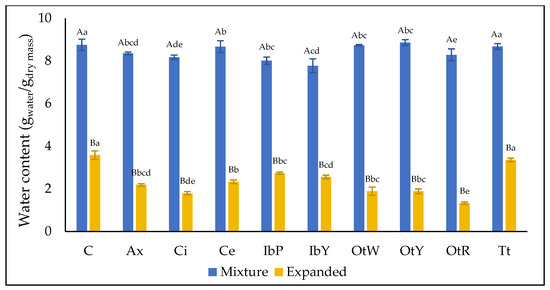 Mean values and standard deviations of the water content of the mixture and expanded snacks. Different capital letters represent significant differences (p < 0.05) by process, and lowercase letters represent significant differences (p < 0.05) by samples.