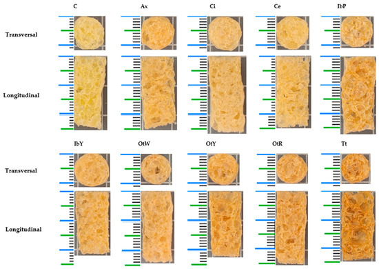 The porosity values ranged from 84.86% to 92.42% (Table 2). The addition of root flour reduced the porosity. The samples observed with the least porosity were Ce, Tt, and IbP. According to previous studies, there is an inversely proportional relationship between the protein content of the mixtures and the snack porosity [54,55]. During extrusion, proteins change, exposing the hydrophobic amino acids initially enclosed. These hydrophobic amino acids compete for water with starch and produce aggregation through protein–protein and protein–water links. Finally, water evaporation occurs, which forms an inflated structure sustained by protein crosslinking [56,57]. These protein alterations influence the change in viscosity, gelation, solubility, and textural properties, which would explain the low porosity values obtained in the Ce, Tt, and IbP snacks, whose raw root flours demonstrated protein contents of 8.37 ± 0.14%, 9.12 ± 0.13%, and 4.65 ± 0.24% [10], respectively [10]. Other factors, such as raw protein type, pretreatment, and extrusion conditions, can also play an essential role [58].