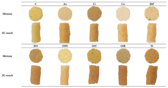 Optical properties were measured with a Minolta spectrophotometer (CM-3600d, Tokyo, Japan) using the standard light source D65 and a standard observer 10. The CIE*L*a*b* color coordinates (spectra 400 to 700 nm) were considered, and the parameters determined were luminosity (L*), chroma (C*), hue (h*), and the total color difference (ΔE) between the mixture before extrusion and the 2G snack. An average of 3 measurements were made in each characteristic.