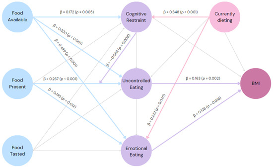 Final inner model: the predictive relationship between the psychological impact of the food environment, aspects of eating behavior, current dieting, and body mass index of 413 adults living in urban areas; β = path coefficient values; p-values of the statistics were based on bootstraps with 5000 samples; blue arrows = paths emerging from PFS factors; violet arrows = paths emerging from TFEQ-R18 factors; light pink arrows = paths emerging from current dieting; light grey arrows = non-significant paths.