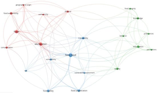 Figure 1 displays a network visualization based on the titles, abstracts, and keywords of selected articles. It shows three clusters presented in different colors. The red cluster mainly deals with food authenticity and the geographic origin of food. The blue cluster outlines food safety-based tools used to combat food fraud such as traceability and vulnerability assessments. Finally, the green cluster is related to consumers and their behavior, preferences, and perceptions.