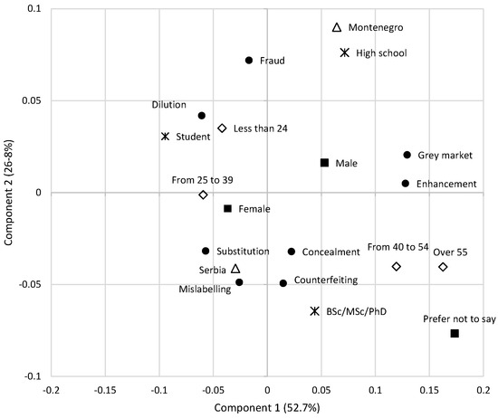 The first multiple response question was “What food fraud have you heard of?”, giving the respondents the opportunity to select from among seven potentially fraudulent activities. The results of the survey showed that almost half of respondents were familiar with terms such as food fraud (57.3%), substitution (55.1%), dilution (52.5%), and mislabeling (47.9%) when asked about various potentially fraudulent activities in the food industry. However, our results showed that respondents were less aware of the other forms of fraudulent practices mentioned in the survey These results highlight a clear discrepancy in the level of awareness of different types of food fraud among respondents, with some specific fraudulent activities being better known than others. As displayed in Figure 2, the main difference between fraudulent activities was confirmed by dilution as opposed to grey market and enhancement (component 1) and fraud as opposed to substitution, concealment, mislabeling and counterfeit (component 2). Respondents from Montenegro and with lower education had opposite attitudes compared to respondents from Serbia and respondents with higher education. The younger population (below 40) had opposed attitudes compared to the older population. Consumers from Montenegro with lower education only recognized fraud in general as the predominant fraudulent activity. Dilution was mostly associated with women, the younger population, and students. In the Serbian population, older respondents and those with a high level of education linked fraudulent activities with substitution, mislabeling, concealment and counterfeit. Although there is a certain degree of misunderstanding of different types of fraud activities, consumers in general do understand what food fraud is [5]. Also, the more they are aware of food practices, the more they are aware of food fraud risks [36].