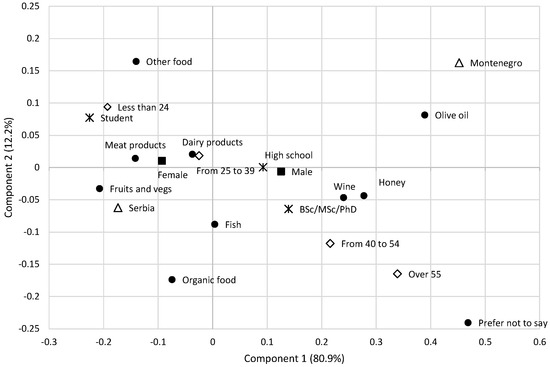 However, trust of consumers related to existing food controls is disturbed due to various fraudulent events that occurred in the previous years [5]. Almost two thirds of respondents (61.9%) confirmed that they know they have bought fake food, while 30.1% believe they have probably bought fraud food). A lack of knowledge paves the way for consumers to play a game of hide and seek with other parts of the food chain, leading to unexpected purchasing patronage [5]. When participants in our survey were asked to name previously purchased fraudulent products, the majority named meat (42.5%) and dairy (35.3%), followed by honey (22.9%), and fish (24.4%). These results are consistent with global data showing that these food categories are particularly susceptible to fraud. Participants’ beliefs were primarily based on personal suspicion (58.9%), own research (18.7%), media reports (10.5%) or recall notices from manufacturers (7.0%) and retailers (4.8%). The correspondence analysis (Figure 3) shows that students and young people identify different types of food subject to fraud than highly educated and older respondents. Types of food subject to fraud were categorized into a group consisting of animal origin food and fruits and vegetables (mainly women), by a population below 40 years of age, (mainly from Serbia), as opposed to wine and honey (older and highly educated) and olive oil (Montenegro).