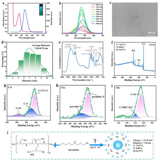 The hydrothermal synthesis method was used to synthesize SP-CDs according to Cui et al. with some modified [21]. The synthesis route of the SP-CDs is shown in Figure 1j. The SP-CDs were synthesized by adding 2.5 g of PEI and 2.5 g of spermidine to a polytetrafluoroethylene-lined hydrothermal autoclave containing 250 mL of deionized water, which was fully dissolved and then placed in an oven and heated at 220 °C for 3 h. After the SP-CDs suspension was cooled to room temperature, it was filtered through a 0.22 μm filter. The SP-CDs were freeze-dried under vacuum for use.