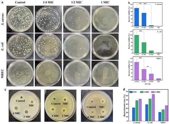Secondly, the bacteriostatic effect of SP-CDs was measured via bacteriostatic zone and bacteriostatic rate (Figure 2c,d). SP-CDs of MIC, 2 MIC, and 4 MIC had an obvious inhibition zone with a diameter greater than 12 mm. The diameter of the antibacterial zone significantly increased with increasing SP-CD concentration (p < 0.05), indicating that the antibacterial effect on the three strains was gradually enhanced. When the concentration of SP-CDs was MIC, the antibacterial zone diameter of S. aureus was 11.72 mm and the antibacterial rate was 31.47%, and when the concentration was increased to 2 MIC, the antibacterial zone diameter reached 15.63 mm and the antibacterial rate also increased to 48.83%. In addition, after treatment with SP-CDs of 4 MIC, the antibacterial zone diameter of S. aureus was 16.74 mm and the antibacterial rate was 52.21%, while the antibacterial zone diameter of E. coli was 21.87 mm and the antibacterial rate was 63.42%. The antibacterial diameters of SP-CDs of MIC−4 MIC on MREC were all greater than 10 mm., and the bacteriostatic rate was 31.03%–36.61%.
