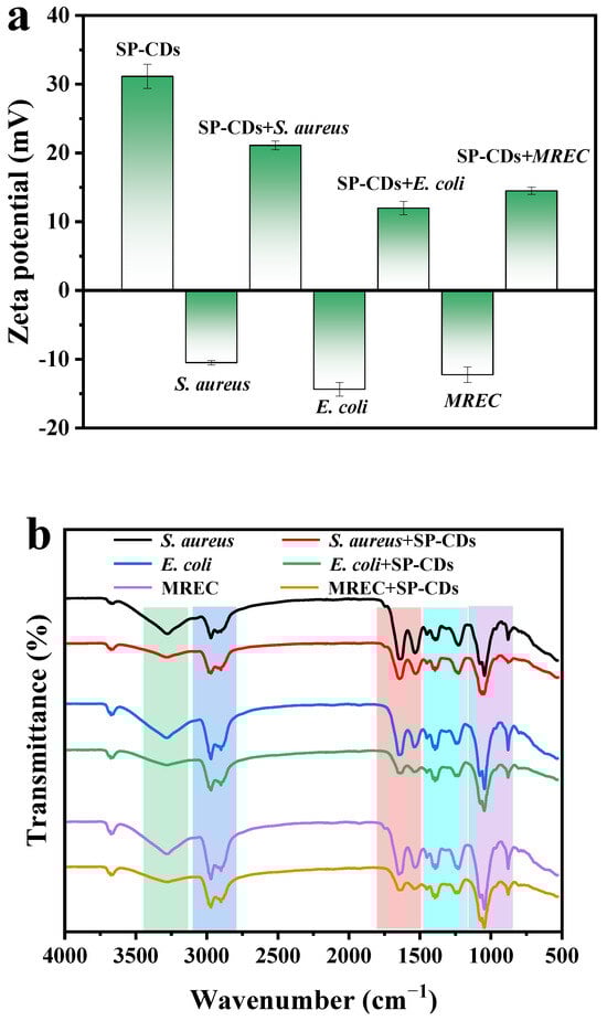 Effect of SP-CDs on bacterial cell surface. (a) Zeta-potential of SP-CDs, S. aureus, E. coli and MREC (with or without SP-CDs treatment). (b) S. aureus, E. coli and MREC (with or without SP-CDs treatment).