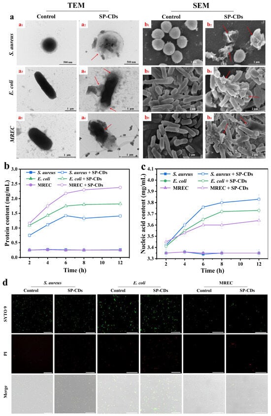 In addition, the relative amounts of bacterial extracellular proteins and extracellular nucleic acids were determined to assess whether SP-CDs inhibit bacterial growth by disrupting cell membrane integrity. The concentration of extracellular soluble proteins was significantly increased in the three strains of SP-CDs-treated bacteria compared with the control (Figure 4b). After 10 h of treatment, the protein contents of the SP-CDs-treated S. aureus, E. coli and MREC bacterial suspensions were 9.5, 7.3 and 5.6 times higher than that of the control, respectively.