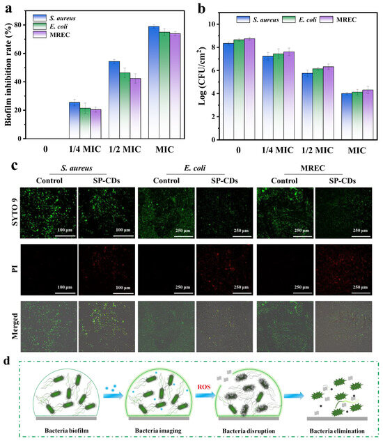 Bacteria develop a dense biofilm that protects them from antibiotics. Therefore, after clarifying the antibacterial activity of SP-CDs, the anti-biofilm ability of SP-CDs was explored. The inhibition ability of SP-CDs against S. aureus, E. coli and MREC was determined via crystal violet staining. As shown in Figure 6a, SP-CDs treatment significantly inhibited the biofilm formation of the three bacteria, and the biofilm inhibition rate increased with increasing SP-CDs concentration. In the treatment of S. aureus, E. coli and MREC with 1 MIC SP-CDs, the biofilm inhibition rates reached 78.95%, 74.95% and 73.95%, respectively.