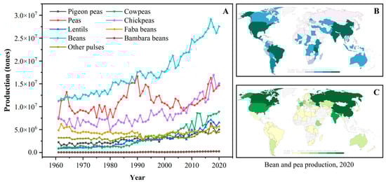 (A): The annual production quantity of pulse crops worldwide from 1961 to 2020 (FAO, 2020); (B): The distribution of bean production worldwide in 2020; (C): The distribution of pea production worldwide in 2020 (data obtained from Our World in Data, https://ourworldindata.org/, accessed on 17 July 2023).