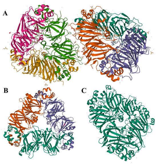 Diagram of the crystal structure of pea globulin from the PDB database (http://www.rcsb.org/pdb, accessed on 17 July 2023); (A): legumin (PDB entry: 3KSC); (B): vicilin (PDB entry: 7U1I); (C): convicilin (PDB entry: 7U1J).