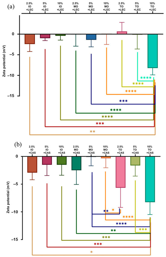 The zeta potential for all tested emulsions stabilized with (a) lecithin (LEC) or (b) casein (CAS); IO—inca inchi oil, MO—moringa oil, TO—tamanu oil; samples marked with different number of asterisks denote files of statistically significant differences.