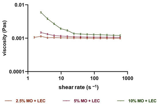 Viscosity curve for moringa oil (MO) emulsions with lecithin (LEC) as a stabilizer.