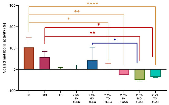 Relative metabolic activity for the C. albicans with IO—inca inchi oil, MO—moringa oil, TO—tamanu oil; lecithin—LEC; casein—CAS; samples marked with different number of asterisks denote files of statistically significant differences.