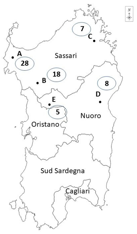 Driven hunts were performed with hunting dogs during early mornings by parties of five to fifteen hunters; the hunters, armed with rifles, set up various positions, while beaters and hounds herded the boars in the direction of the guns. Carcasses were bled in the field, then the wild boars were collected in pick-up vehicles by the end of the hunting day. After harvesting, the carcasses were transported to dedicated facilities, “hunting houses”, where the slaughtering operations were carried out. Five hunting houses were utilized: three (A, B, C) were in the Sassari province and two (D, E) were in the Nuoro province. Figure 1 specifies the position of the hunting houses in Sardinia.