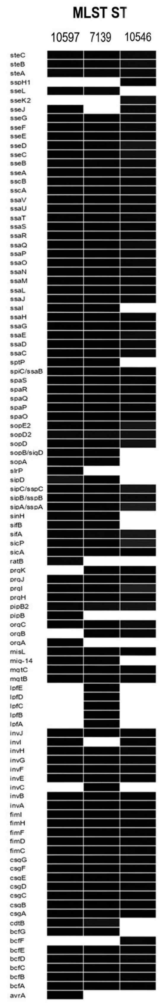 The three Salmonella isolates we found were classified as follows: (i) S. subsp. salamae (antigenic formula 48:h,z:1,5), (ii) S. ser. elomrane (9:z38:-) and (iii) a novel serotype of S. subs. enterica (28:e,h:z6). The third Salmonella strain identified is not currently referable to any known serotype and the strain has been sent to the European Union Reference Laboratory for Salmonella (EURL-Salmonella) for further study. Multilocus sequence types (ST) of the strains were, respectively, ST10546, ST7139 and ST10597, as reported in Table 3. The genetic characterization of genes in the virulence factors database showed that a total of 104 virulence genes were detected in the three Salmonella isolates. The Salmonella operons bcfABCDEFG, csg(agf)ABCDEFG, fimCDFHI, invABEFGHJ, and sipABCD were identified in all the isolates; moreover, S. elomrane also had the lpfABCDE operon. The following plasmids were detected: IncFIB(S) in ST 7138 strain, IncFII(S) in the novel serotypes. Salmonella isolates virulence genes detected are reported in Figure 2.