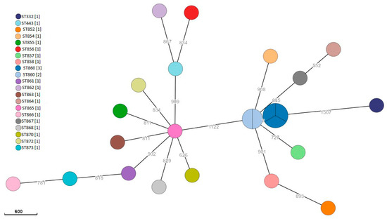 Among Y. enterocolitica isolates, 13/24 (54.2%) were biotype 1A and 11/24 (45.8%) were biotype 2. Biotype 2 strains were serotype O:3 (6/11, 54.5%) and O:5 (3/11, 27.3%); in 2/11 (18.2%), it was not possible to detect the serotype phenotypically. Among the isolates, 23 STs were detected. The single linkage tree in Figure 2 shows the genetic linkage between the isolates. The most common MLST sequence type was ST860, detected in five samples isolated from four wild boars hunted on two different days but in the same hunting house (A): the single linkage tree based on cgMLST (Figure 3) shows the genetic linkage between the isolates; regarding ST860 strains, isolates were genetically closely related with <7 SNP.