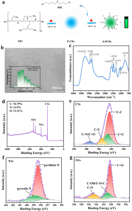S-PCDs were synthesized according to Cui et al. (2021) [16] and the synthesis process is shown in Figure 1a. Amounts of 2.5 g PEI and 2.5 g spermidine were added to 250 mL deionized water, and then transferred into polytetrafluoroethylene-lined hydrothermal reaction autoclave and heated at 220 °C for 3 h to form S-PCDs.