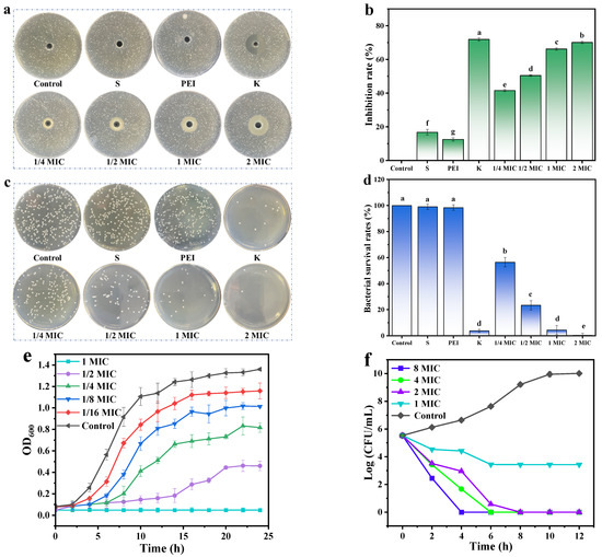 Antibacterial activity of S-PCDs. (a) Inhibition zone diameter, (b) inhibition rate, (c) antibacterial activity, and (d) bacterial survival rates of S-PCDs on S. aureus. S. aureus was treated with different concentrations of S-PCDs. The same concentrations of S and PEI as S-PCDs were used as negative control, and kanamycin was used as positive control. (e) Bacteriostatic curve and (f) bactericidal curve of different concentrations of S-PCDs against S. aureus. The average values of different letters in (b,d) were significantly different when p < 0.05.