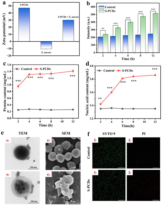 Bacterial cell membrane damage. (a) Zeta-potential of S-PCDs, S. aureus (with or without S-PCD treatment). (b) Uptake of PI in S. aureus. Effect of S-PCDs on (c) the extracellular protein content and (d) the extracellular nucleic acid content of S. aureus. (e) TEM and SEM images of S. aureus. S. aureus without treatment (e1, e2, f1 and f2) or with treatment of S-PCDs (e3, e4, f3 and f4). (f) CLSM images of S. aureus were stained by SYTO 9/PI dual fluorescence staining. All bacteria alive and dead were stained by SYTO 9 showing green fluorescent intensity. Only dead bacteria can be stained by PI emitting red fluorescent intensity. For SYTO 9: λex = 488 nm; for PI: λex = 552 nm. The scale bar is 75 μm. ** p < 0.01, *** p < 0.001.