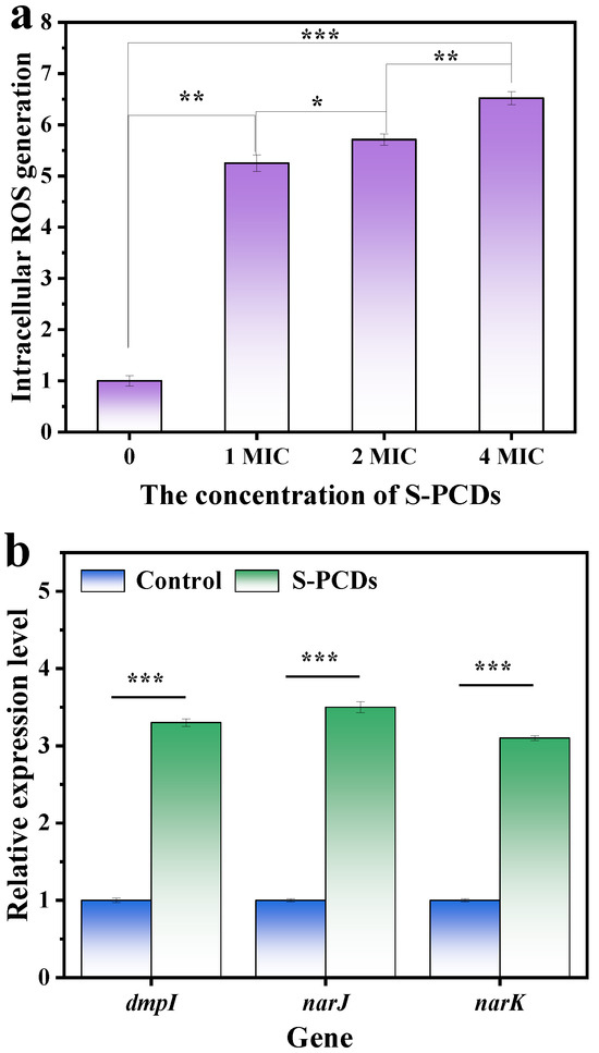 The nanomaterials can contribute to the disruption of the metabolic balance of intracellular oxidation reactions by upregulating genes encoding oxidation-stimulating enzymes (such as dmpI, narJ and nark) to produce large amounts of ROS [22]. The expression of three indicator genes, namely the three oxidative regulatory genes dmpI, narJ and narK, which can maintain intracellular redox balance, was detected after S-PCD treatment. The dmpI gene encodes 4-oxalocrotonate tautomerase, which participates in the oxidative catabolism of toluene, o-xylene, 3-ethyltoluene and 1,2, 4-tritoluene into corresponding intermediates in the citric acid cycle, and produces ROS as a by-product. The narJ and narK genes are important participants in respiratory nitrate reductases, which transfer electrons from NADH or NADPH to nitrate, assisting in nitrate transport and nitrate reduction [34]. The results showed that treatment with S-PCDs could induce the expression of three oxidation genes to be significantly upregulated to 3.3, 3.5 and 3.1 times (p < 0.001), respectively (Figure 4b), which was also consistent with the data generated by ROS. Since ROS is a by-product of intracellular redox metabolism, the difference in ROS production in the S-PCD treatment group may be due to the different redox reactions of bacteria to them [23]. Oxidative stress-induced lipid peroxidation leads to cell membrane rupture, which causes DNA degradation induced by oxidative stress after CDs enters bacterial cells, resulting in bacterial death [35].