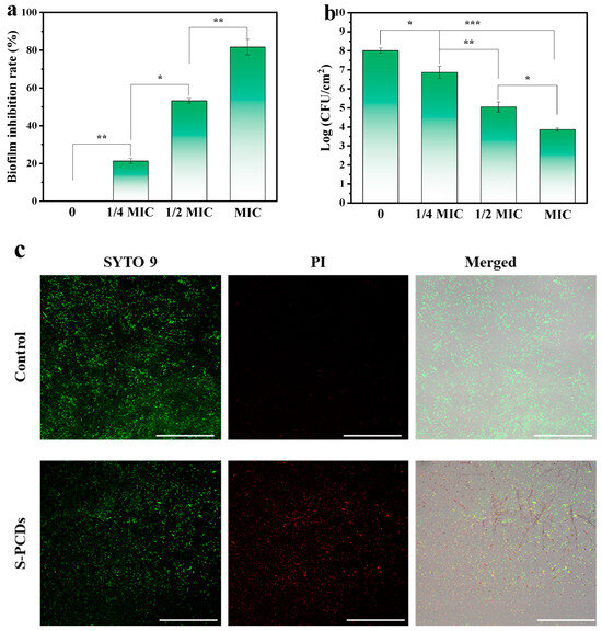 Antibiofilm activity of the S-PCDs. (a) Effects of S-PCDs on biofilm formation of S. aureus. (b) The number of viable bacteria from biofilms on coverslips surfaces. (c) CLSM images of S. aureus were stained by SYTO 9/PI dual fluorescence staining. All bacteria alive and dead were stained by SYTO 9 showing green fluorescent intensity. Only dead bacteria can be stained by PI emitting red fluorescent intensity. For SYTO 9: λex = 488 nm; for PI: λex = 552 nm. The scale bar is 250 μm. * p < 0.05, ** p < 0.01, *** p < 0.001.