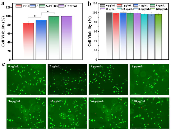 Safety evaluation of S-PCDs. (a) Cell viability of L929 fibroblasts treated with PEI, S and S-PCDs (2 μg/mL) for 24 h. (b) Cell viability of L929 fibroblasts treated with different concentrations of S-PCDs (0, 2, 4, 8, 16, 32, 64 and 128 μg/mL) for 24 h. (c) Live/Dead fluorescence staining images after 24 h incubation. * p < 0.05.