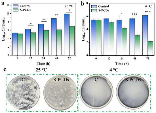 The results of pasteurized milk treated with S-PCDs after S. aureus infection are shown in Figure 7. When the pasteurized milk was stored at 25 °C for different times, S-PCDs inhibited the growth of S. aureus (Figure 7a). After 24 h and 72 h treatment with S-PCDs, the concentration of S. aureus decreased from 7.48 to 5.98 log10 CFU/mL and 9.95 to 6.95 log10 CFU/mL, respectively (p < 0.01). The results showed that S-PCDs had a significant inhibitory effect on S. aureus in pasteurized milk. S. aureus in pasteurized milk survived and grew normally at 4 °C for 72 h (Figure 7b). The antibacterial activity of S-PCDs was significantly different after 24 h compared with the control group (p < 0.05). Compared with the control group, the number of microorganisms was significantly decreased after S-PCD treatment for 72 h (p < 0.001). This indicated that S-PCD treated milk can be stored for a long time. The morphology of the treated pasteurized milk sample was then observed by laying it on a flat plate. After growing S. aureus at 25 °C for 72 h, a large amount of precipitation was observed in all samples (Figure 7c), accompanied by a strong rancid smell. Since proteins and lipids in milk are agglomerated under the growth and metabolism of microorganisms, S-PCD treatment can effectively reduce the formation of precipitation, which means that its growth and metabolism are inhibited.