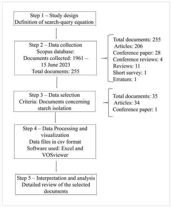 The Scopus database was used to collect the papers in Step 2, as it contained an important number of specialized publications on engineering, chemistry, and food publishing research concerning starch. The search-query equation was used to find the document in the TITLE-ABS-KEY section of the database. Figure 1 shows that 255 documents were found, and 80.8% of the documents correspond to articles.